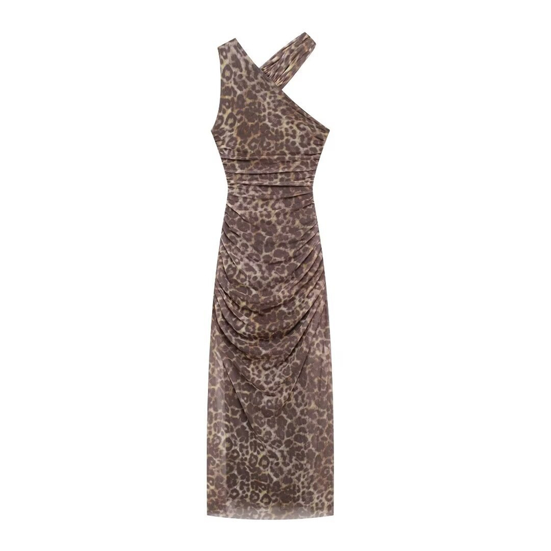 Europe And The United States Wind Animal Print Tulle Hanging Neck Backless Slim Long Split Dress