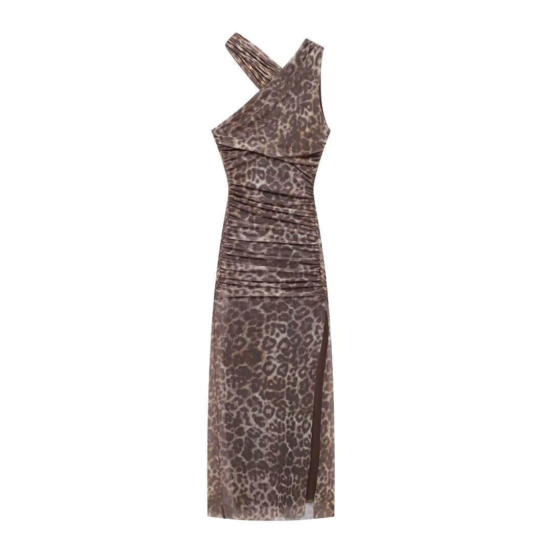You are here: Home / Products / Woman / Dress / Europe And The United States Wind Animal Print Tulle Hanging Neck Backless Slim Long Split Dress