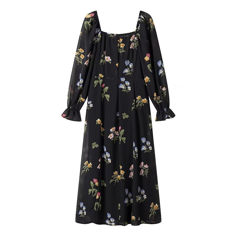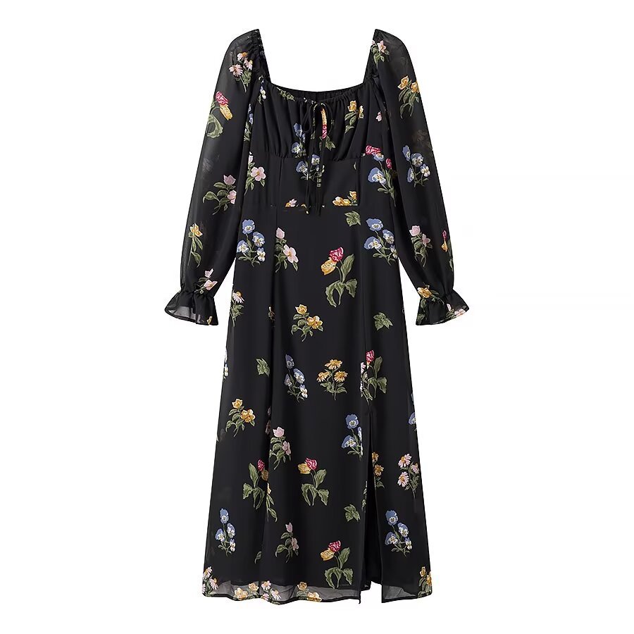 You are here: Home / Products / Woman / Dress / Spring And Summer New French Tea Break Niche Design Retro Black Square Neck Floral Dress Women