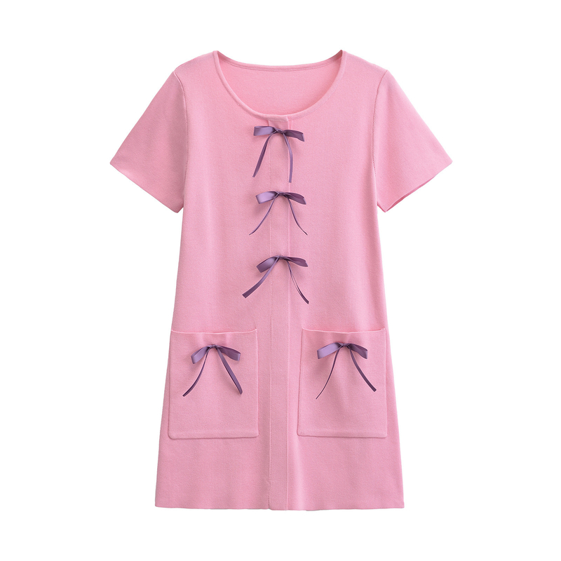 Women's New Bow Trim Knit Round Neck Short Sleeve Dresses