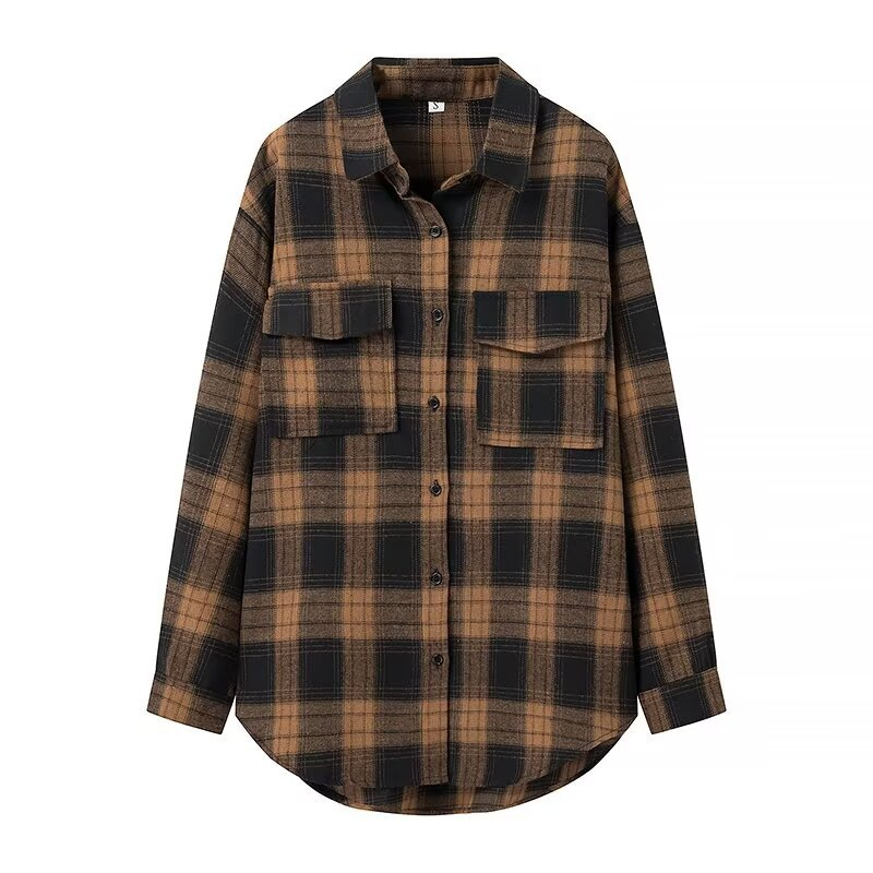 Women's Retro Plaid Long Sleeve Shirt Loose Casual Single Breasted Shirt