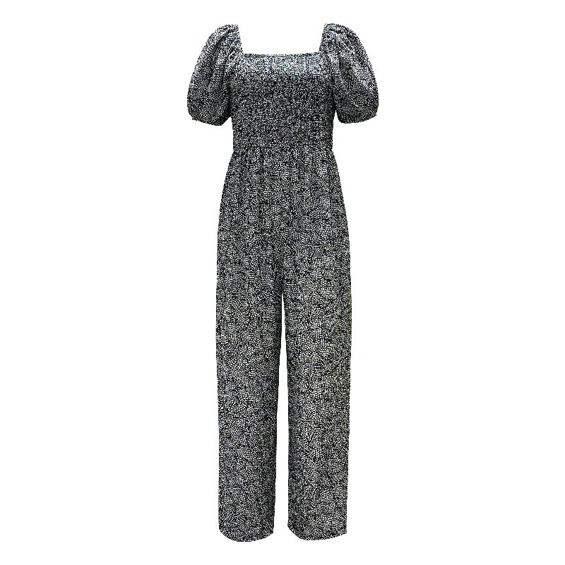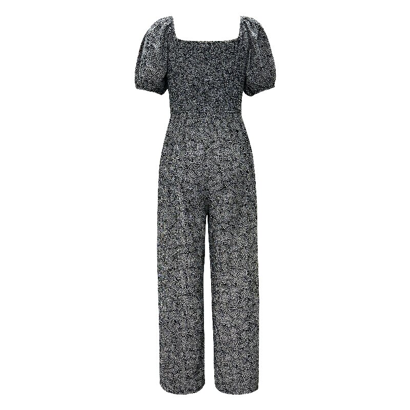 Printed Square Neck Puff Sleeve Jumpsuit | Women Summer Short Sleeve European Style Elastic Waist Jumpsuit