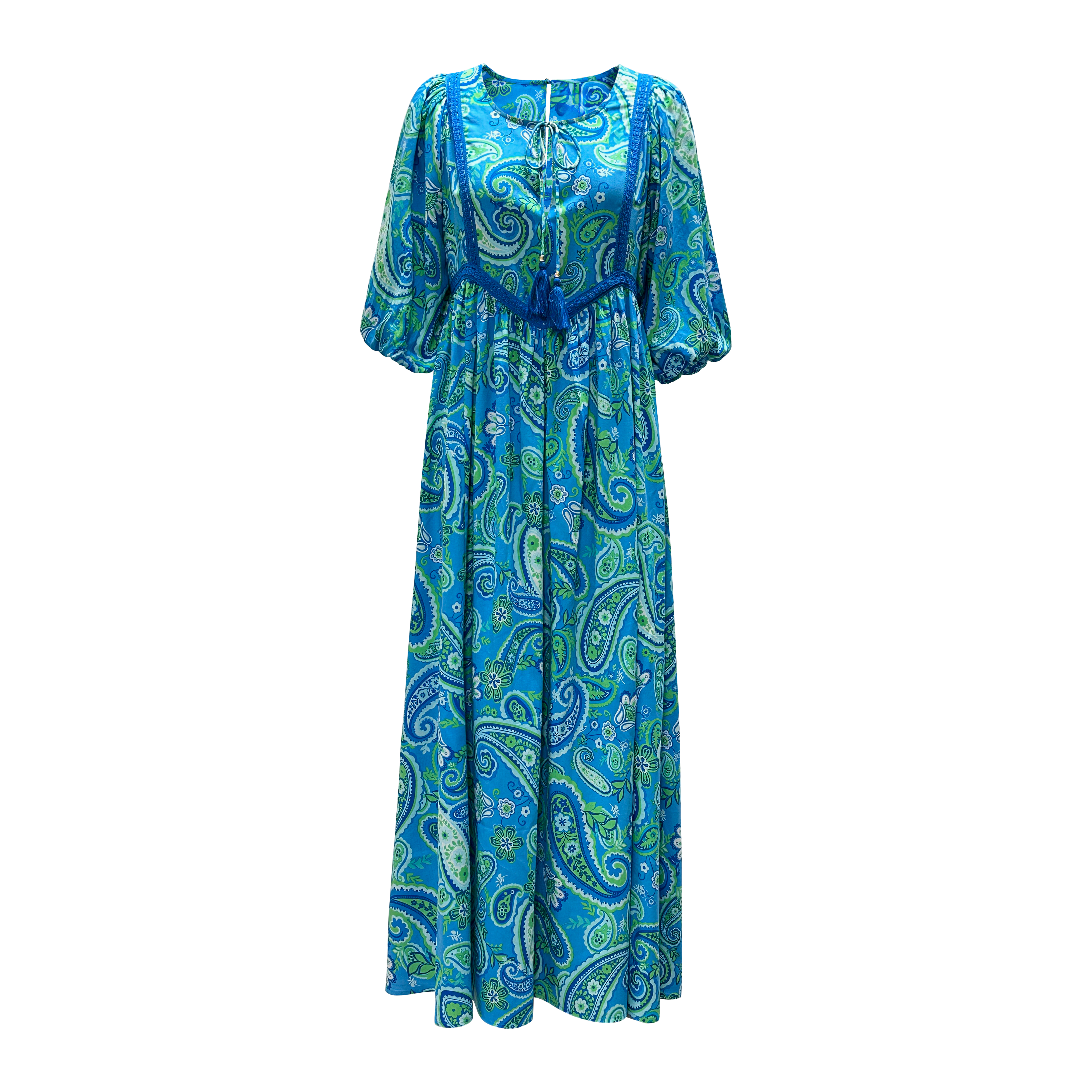 Women Fashion Summer Blue Printing Short Sleeve Vacation Resort Boho Maxi Dress